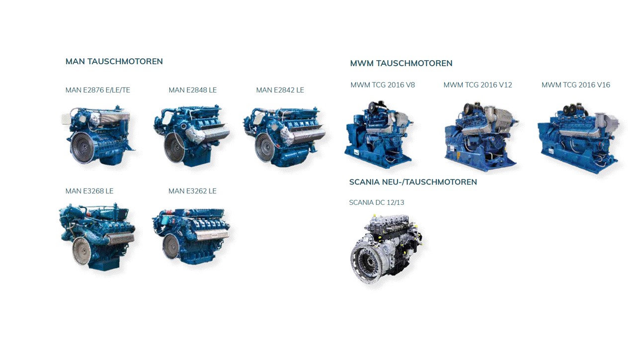 VERSCHIEDENE AUSBAUSTUFEN: Für die Baureihen MAN, MWM und SCANIA bieten wir passgenaue Lösungen in unterschiedlichen Ausbaustufen. Von der Generalüberholung einzelner Tauschmotoren bis hin zu kompletten Gensets bei MWM.
